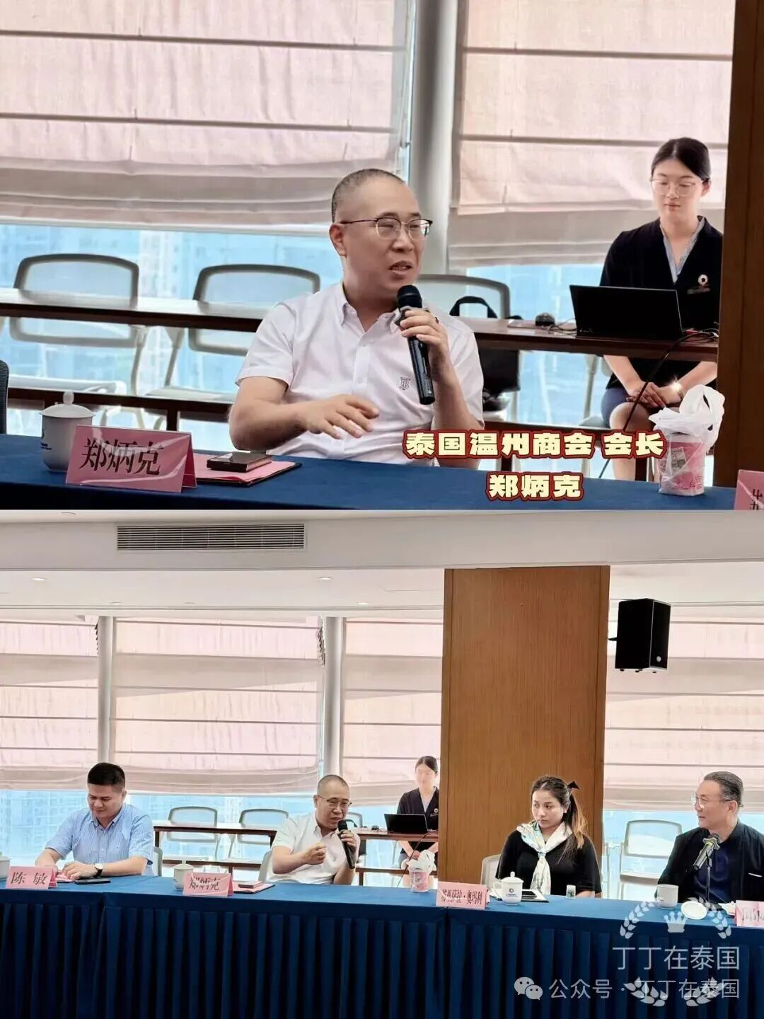 泰国温州商会会长郑炳克、执行会长兼侨务部主任陈芝帮、会务顾问陈敏等代表出席会议,并与温州企业家代表围绕“两地资源共享、产业互补、合作共赢”等议题进行了深入交流。郑炳克会长表示,泰国温州商会将继续发挥桥梁纽带作用,积极推动温州与泰国企业的双向交流与投资合作,助力更多优质项目落地,促进中泰经贸关系高质量发展。